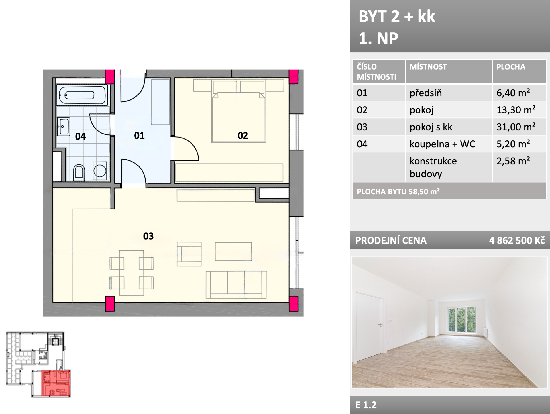 Tato prostorná a vzdušná bytová jednotka o ploše 58,5 m² se nachází v 1. nadzemním podlaží v sekci E, která je postavena jako první etapa projektu.