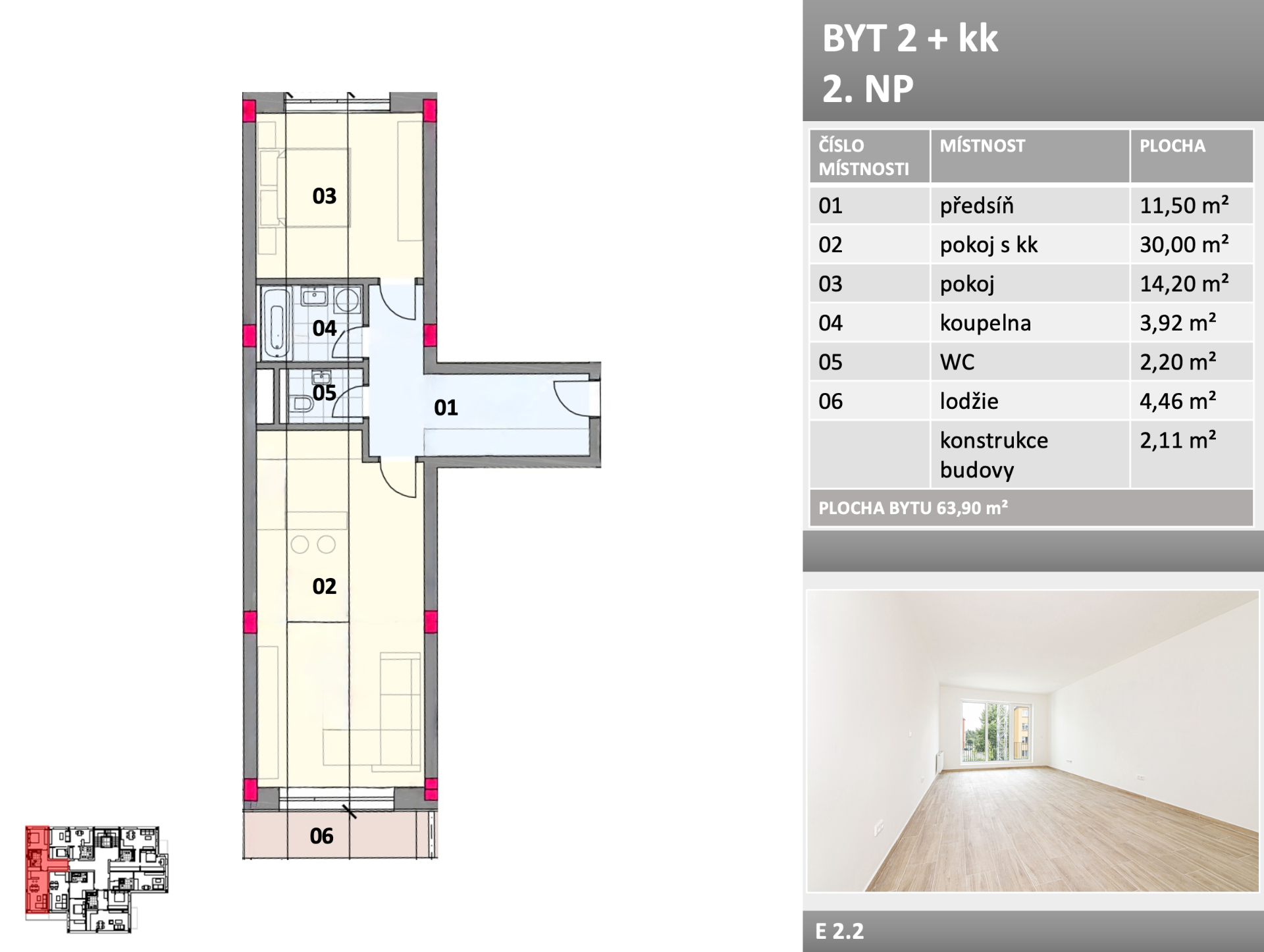 Tato prostorná a vzdušná bytová jednotka o ploše 63,90 m² se nachází v 2. nadzemním podlaží v sekci E, která je postavena jako první etapa projektu. K bytu náleží lodžie, která poskytuje příjemný venkovní prostor pro relexaci.