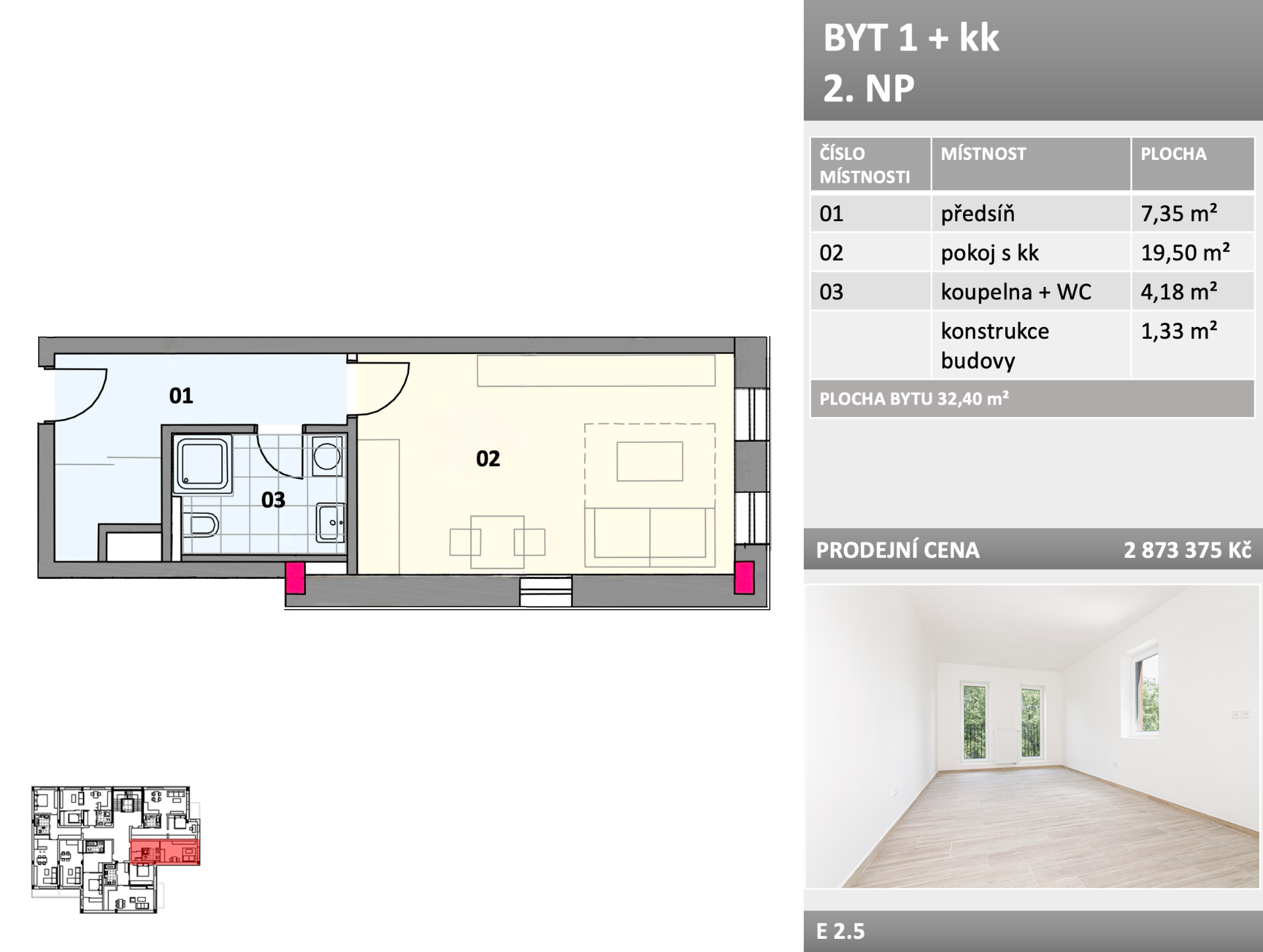 Tato prostorná a vzdušná bytová jednotka o ploše 32,40 m² se nachází ve 2. nadzemním podlaží v sekci E, která je postavena jako první etapa projektu.