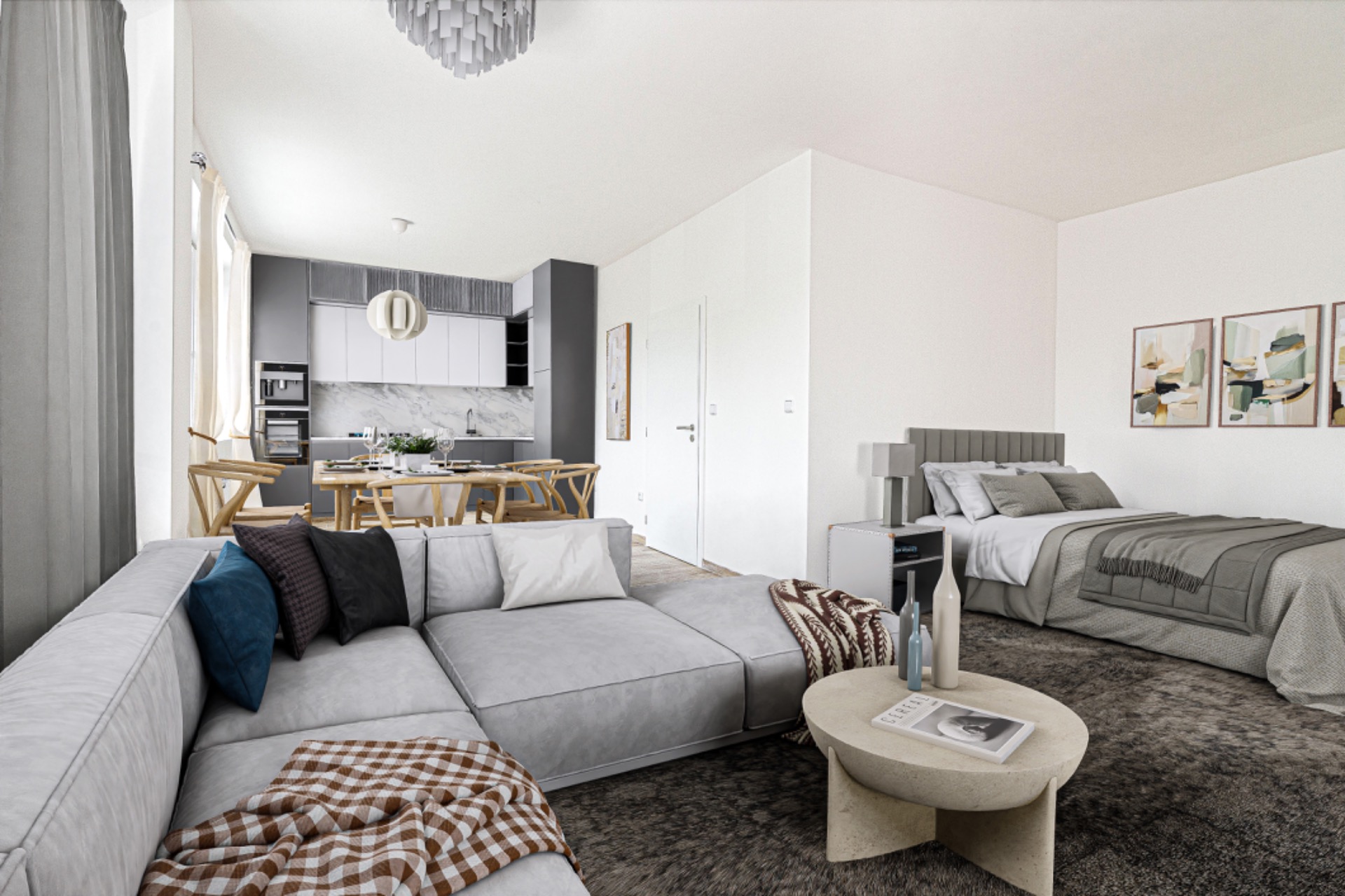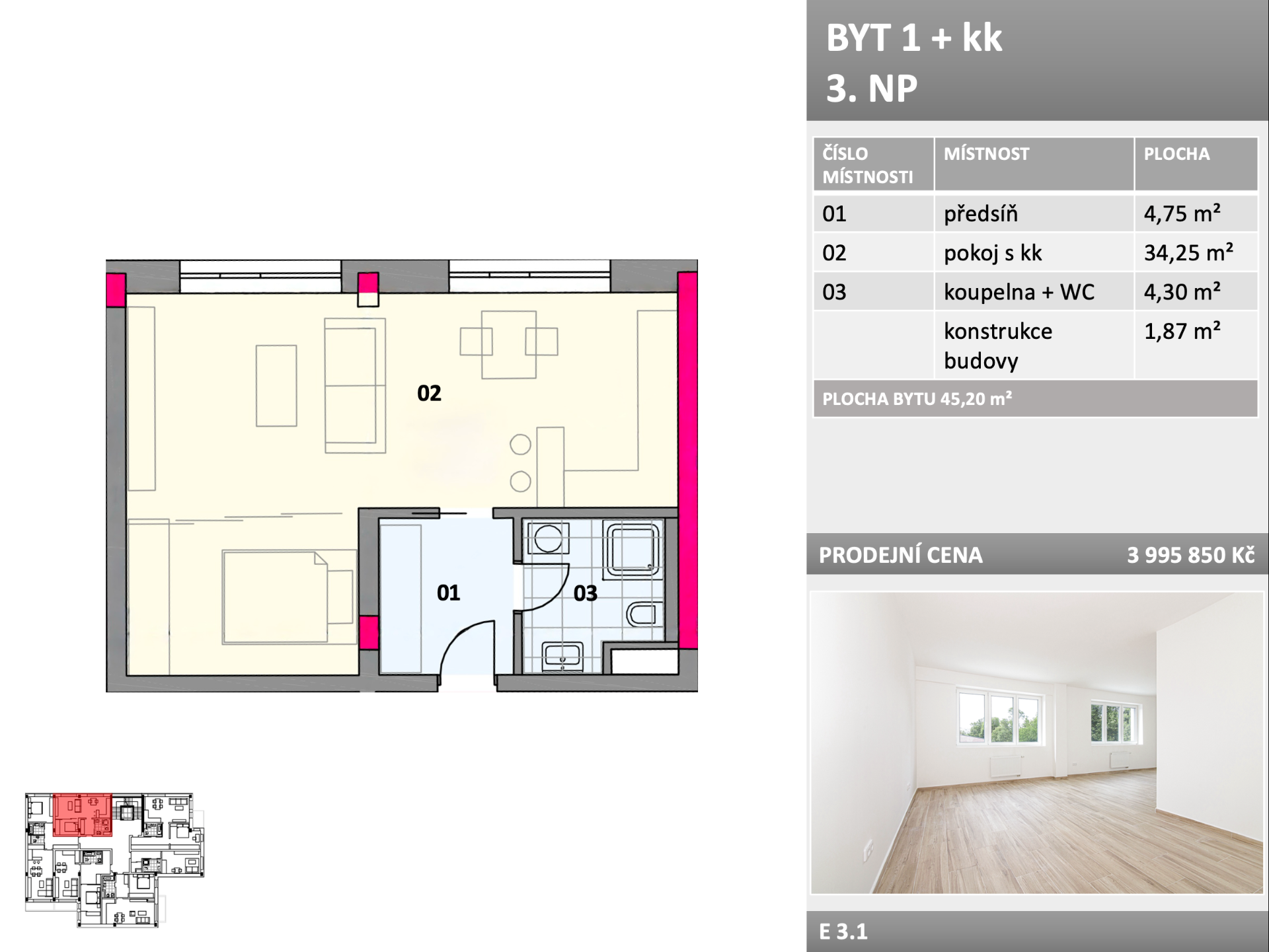 Tato prostorná a vzdušná bytová jednotka o ploše 45,2 m² se nachází ve 3. nadzemním podlaží v sekci E, která je postavena jako první etapa projektu.