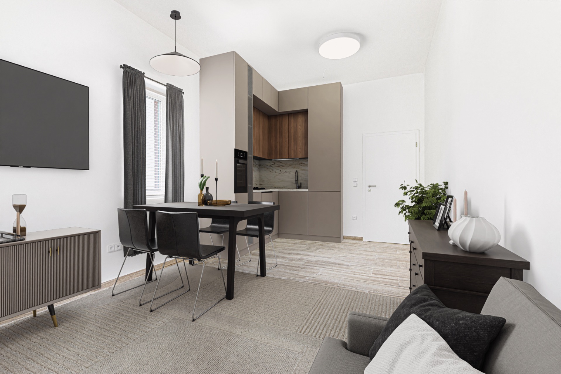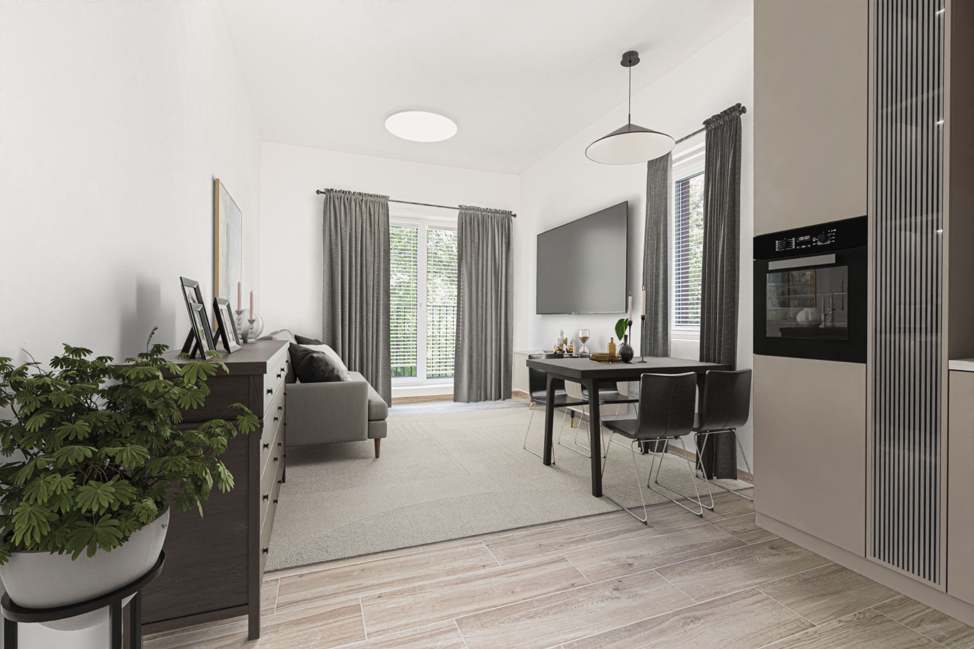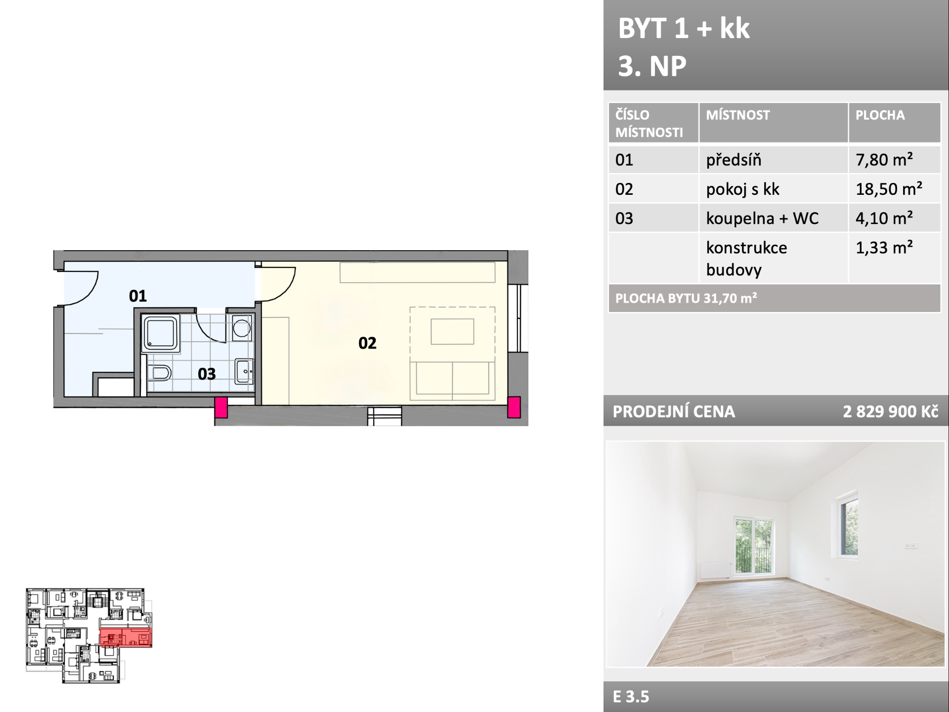 Tato prostorná a vzdušná bytová jednotka o ploše 31,7 m² se nachází v 3. nadzemním podlaží v sekci E, která je postavena jako první etapa projektu.