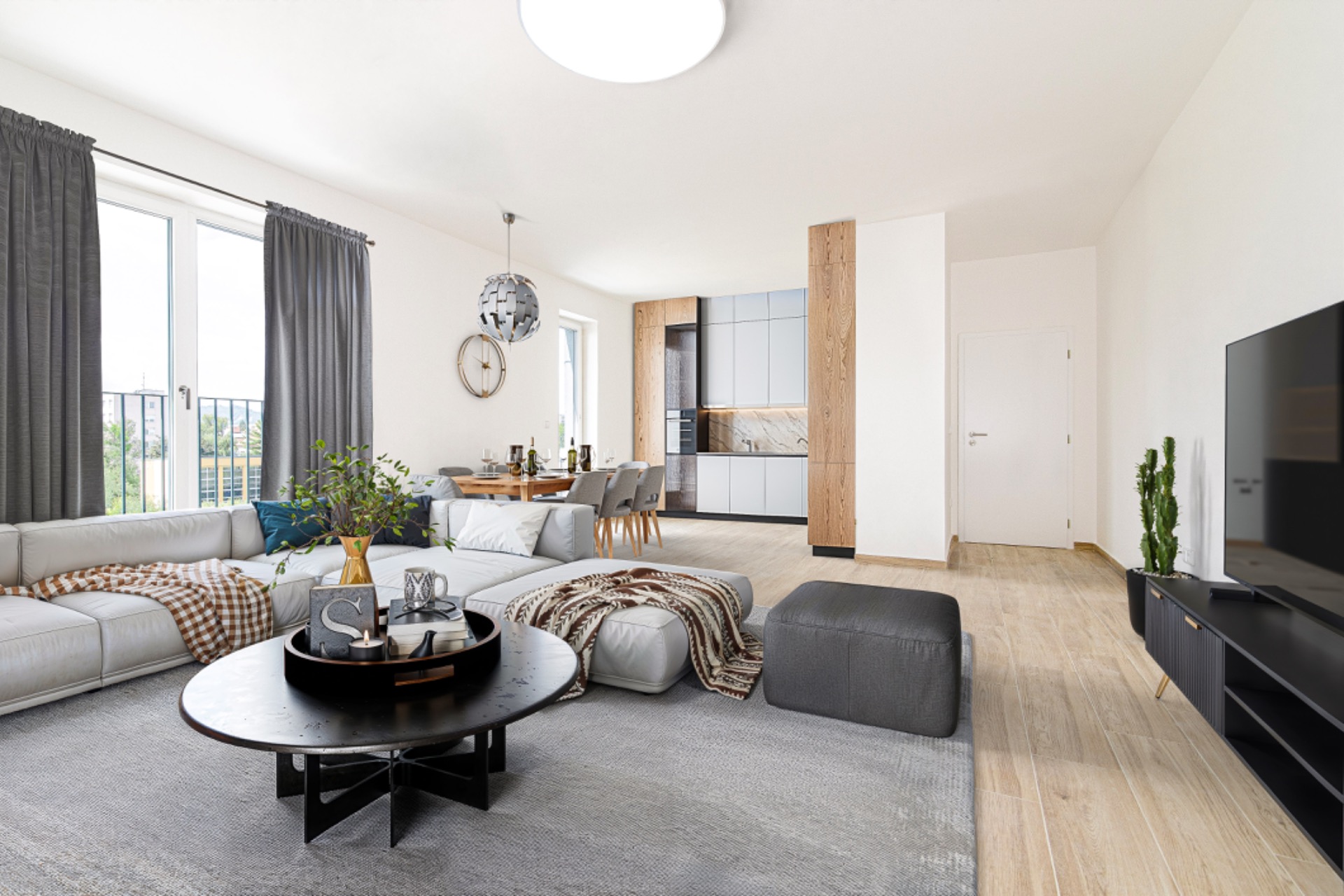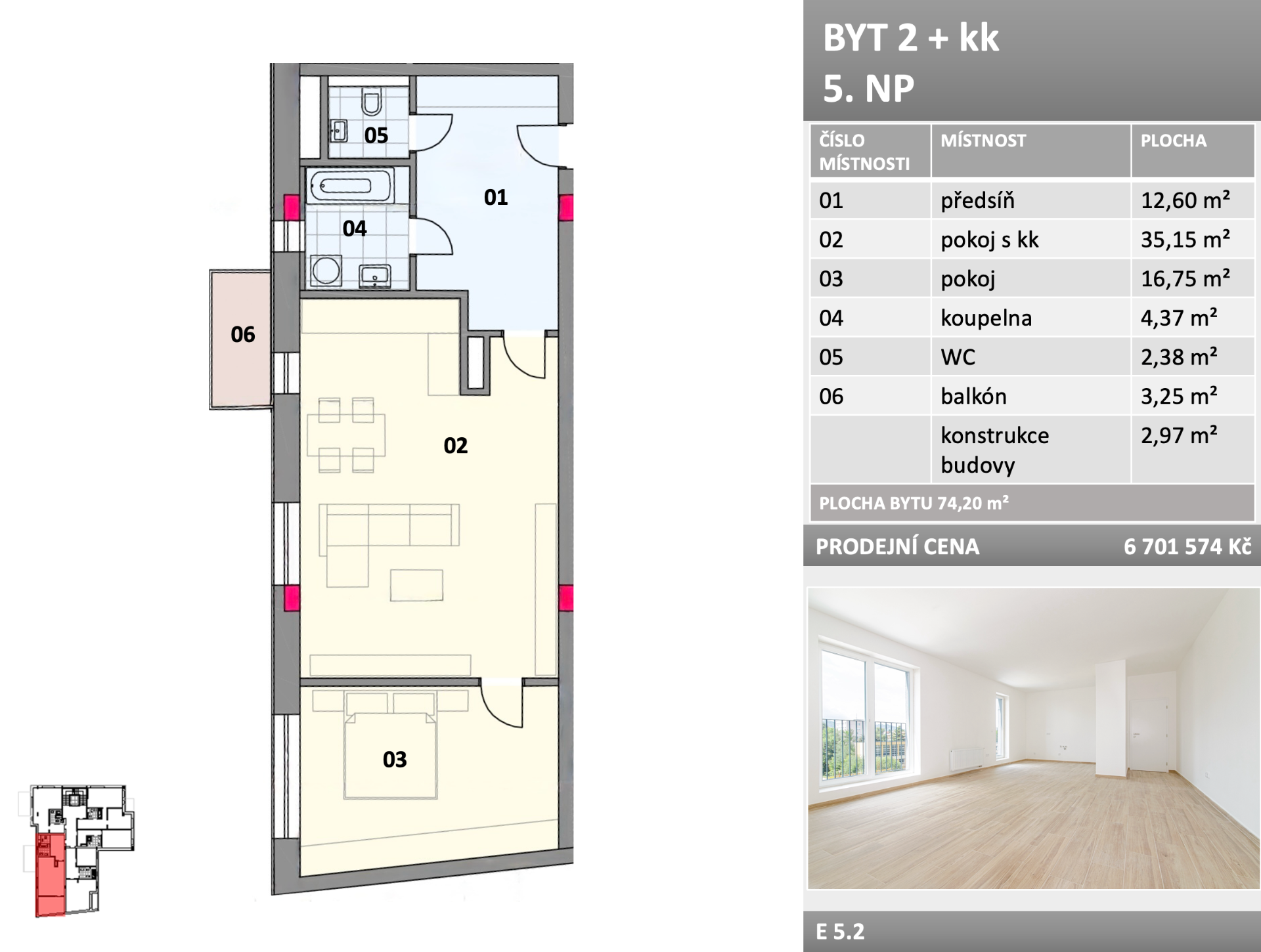 Tato prostorná a vzdušná bytová jednotka o ploše 74,2 m² se nachází v 5. nadzemním podlaží v sekci E, která je postavena jako první etapa projektu. K bytu náleží balkón, který poskytuje příjemný venkovní prostor pro odpočinek.