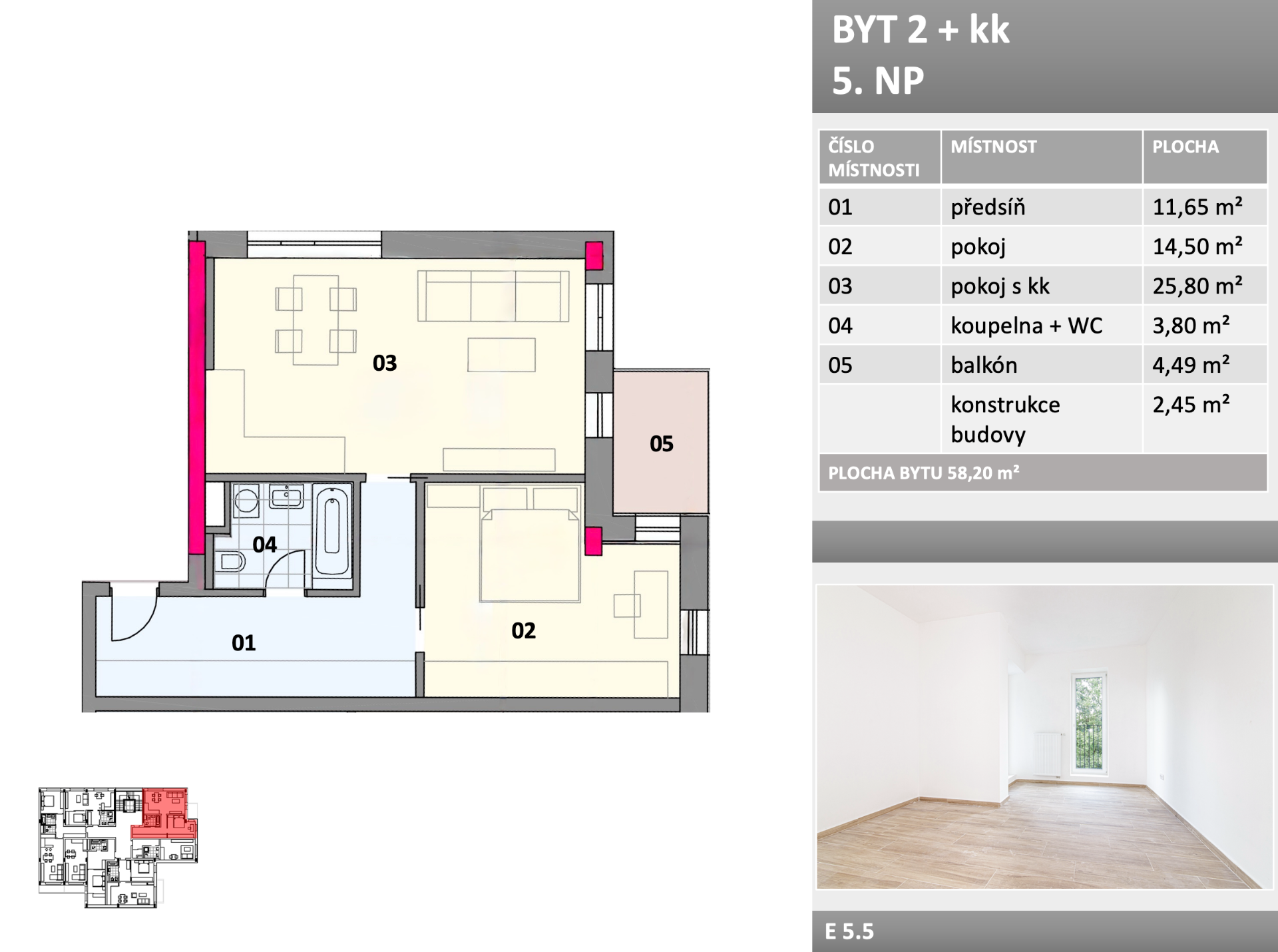 Tato prostorná a vzdušná bytová jednotka o ploše 58,2 m² se nachází v 5. nadzemním podlaží v sekci E, která je postavena jako první etapa projektu. K bytu náleží balkón, který poskytuje příjemný venkovní prostor pro odpočinek.